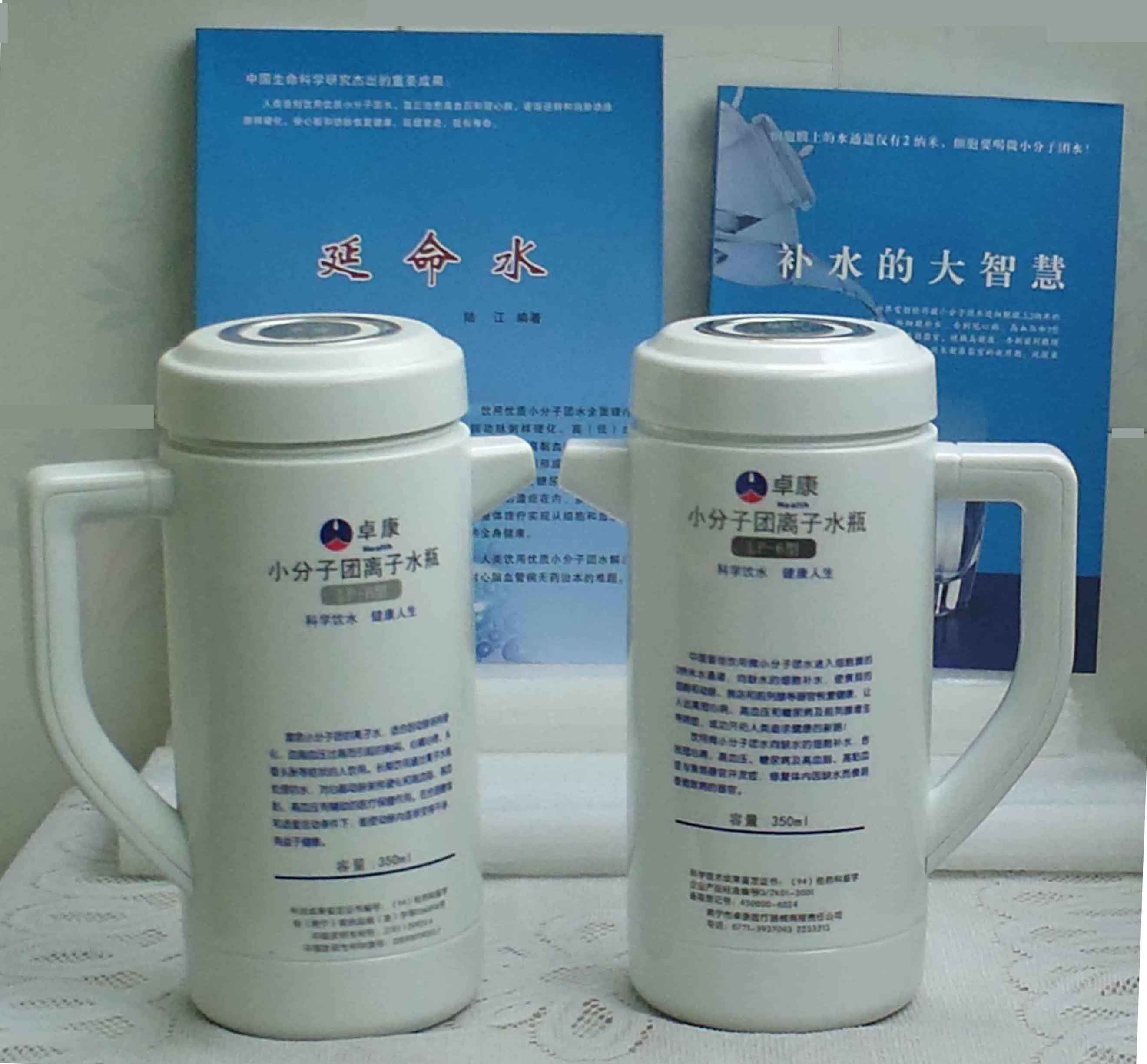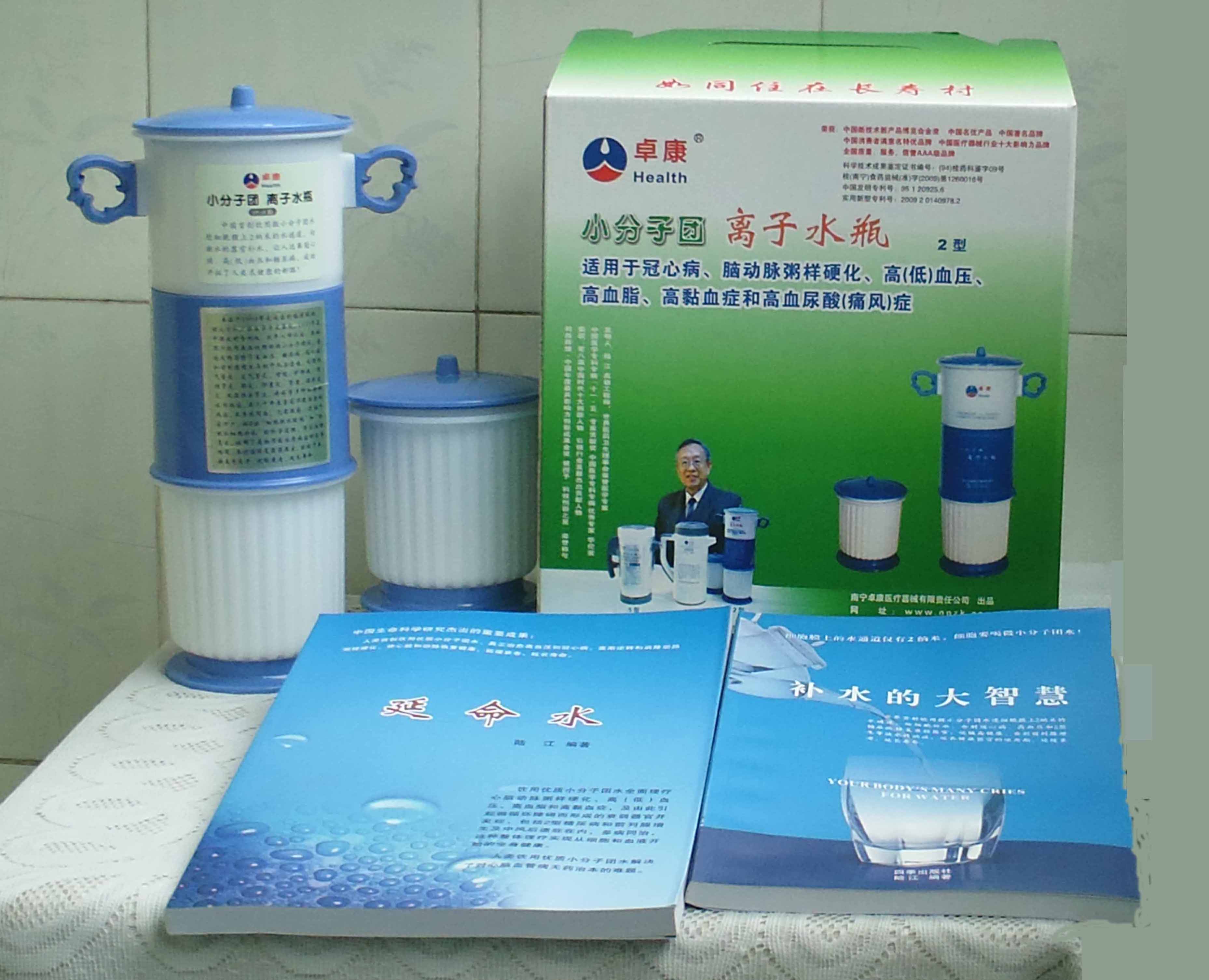 本品大量用戶的使用效果表明,能治愈冠心病、腦動脈硬化、原發性高(低)血壓、高血脂、高粘血癥、高血尿酸癥(痛風)和2型糖尿病、衰弱器官并發癥(前列腺增生、腎衰與尿毒癥)及中風后遺癥等療效好。產品配信譽卡。使用壽命30年,不換芯,易清洗。團購優惠。從郵局匯款,匯費1%,地址按本頁下方地址、聯系人寫。從銀行匯款,請點擊[聯系匯款]欄,從工商銀行匯款,建設銀行、農業銀行匯款,均免收匯費,匯款后20--30分鐘內發短信,可用微信轉帳,均免匯費,微信號即手機號13768308380。匯款后,告知你的姓名和地址,我公司聯系人手機號是:13768308380卓康牌離子水瓶為我公司獨家生產,郵購產品配《補水的大智慧》彩印書一本,另配四季出版社出版的新書《補水的大智慧》一本,并配光盤一張(含央視主持人釆訪陸江的對話視頻)。目前市場和"淘寶網"上有人兜售假冒的偽品,望讀者審察辯別真偽,造假者剽竊假冒本公司的各種證、獲獎獎項、專利號和外包裝盒上的中英文字,包括科技成果的鑒定意見等,請讀者注意防偽。如何識別假貨?已經買了假貨怎么辦?(請點擊[打假掠影][打假掠影])。